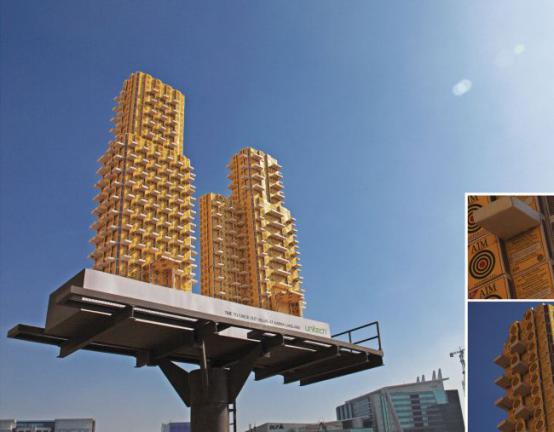 1、印度Karma Lakelands新別墅社區戶外廣告牌,由數百個火柴盒粘貼成社區高樓的模型,別墅區建筑外形觀眾一目了然。